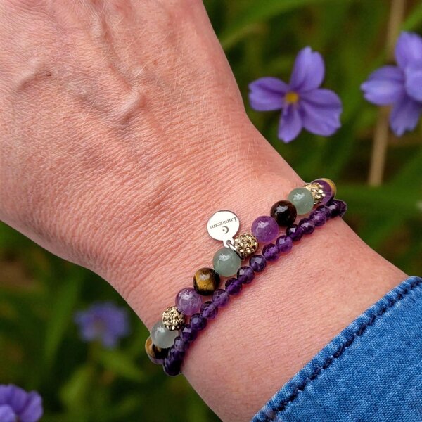 Verstelbare handgeknoopte armband: een mix van amethist, tijgeroog, aventurijn en glinsterende 6mm rhinestone kralen. Dankzij het stevige waxkoord en de schuifknoop eenvoudig op maat te stellen voor een perfecte pasvorm.